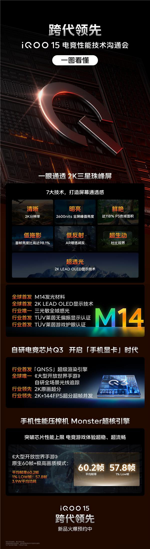 此次iQOO 15电竞性能技术沟通会上亮相的2K三星珠峰屏、自研电竞芯片Q3和Monster超核引擎,将强强联手打破移动端与PC间的游戏视效壁垒,实现真正的游戏体验进化,引领移动端游戏视效率先进入下个时代。