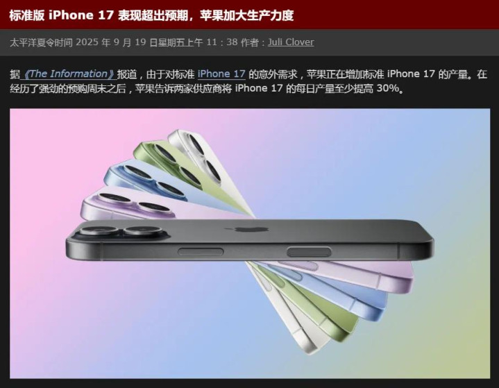 面对这一市场变化,苹果要求供应商将iPhone 17标准版的日产量提高约40%,并通知部分非电子零部件供应商将日供货量提升约30%。