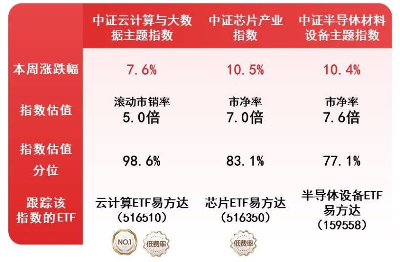 据上图所示,易方达基金旗下云计算 ETF 易方达(516510),跟踪中证云计算与大数据主题指数,为同标的指数中规模居第一的产品,管理费 + 托管费 0.2%/ 年;芯片 ETF 易方达(516350),跟踪中证芯片产业指数,管理费 + 托管费 0.2%/ 年;半导体设备 ETF 易方达(159558),跟踪中证半导体材料设备主题指数,管理费 + 托管费 0.2%/ 年。